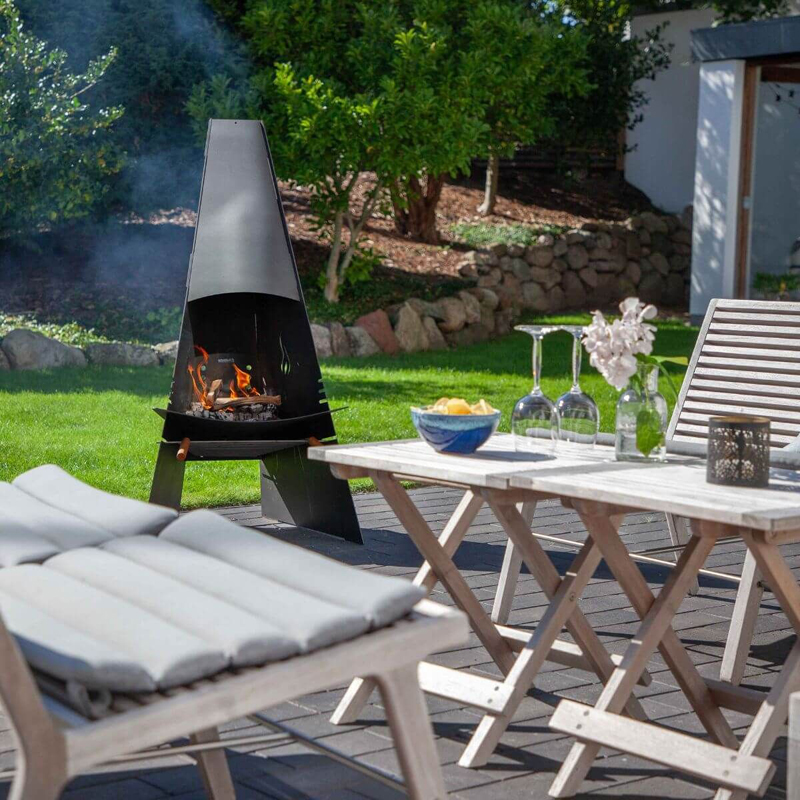 Met een hoogte van 124 cm en een breedte van 60 cm biedt de haard voldoende ruimte voor een krachtig vuur, terwijl het compacte ontwerp hem geschikt maakt voor verschillende soorten buitenopstellingen. Het zwarte staal is hittebestendig en bestand tegen wisselende weersomstandigheden, waardoor deze buitenhaard niet alleen functioneel is, maar ook duurzaam.