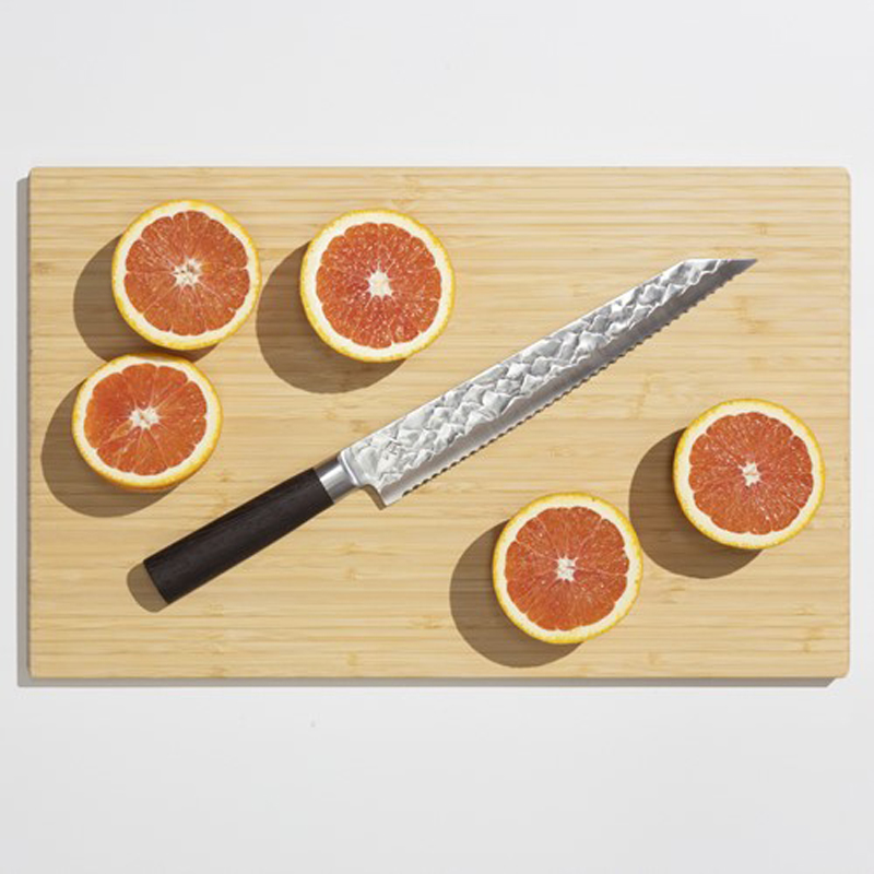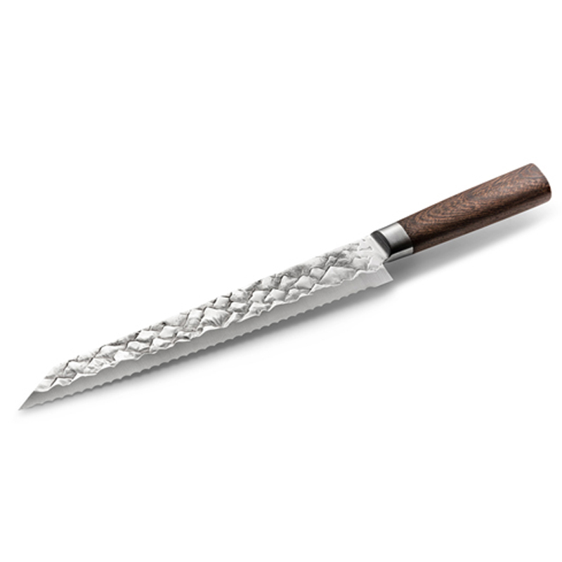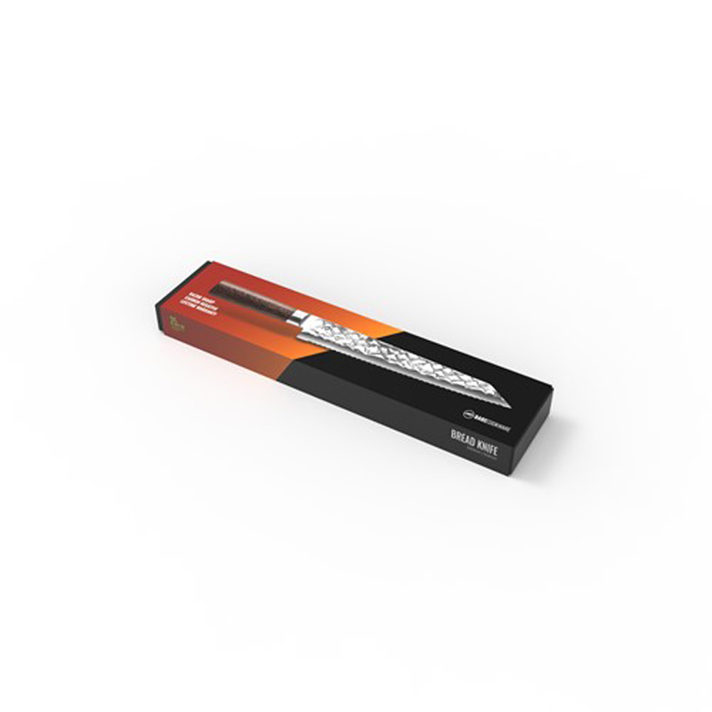 Het BARE Cookware Serrated Knife is een robuust en veelzijdig kartelmes met een 24 cm lang en 3 mm dik roestvrij staal lemmet – perfect voor het moeiteloos snijden van brood, geroosterd vlees en andere taaie producten.