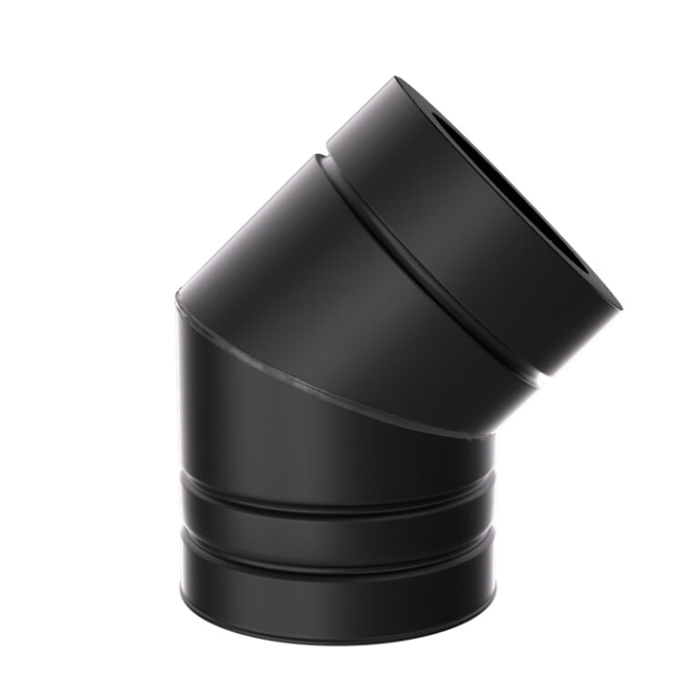 De Bocht 45° Ø125 mm – Isoduct dubbelwandig rookkanaal zwart is perfect voor het maken van een duidelijke maar vloeiende richtingsverandering in je rookkanaal. De dubbelwandige constructie houdt warmte vast en beschermt de buitenzijde. De zwarte uitvoering zorgt voor een moderne uitstraling.