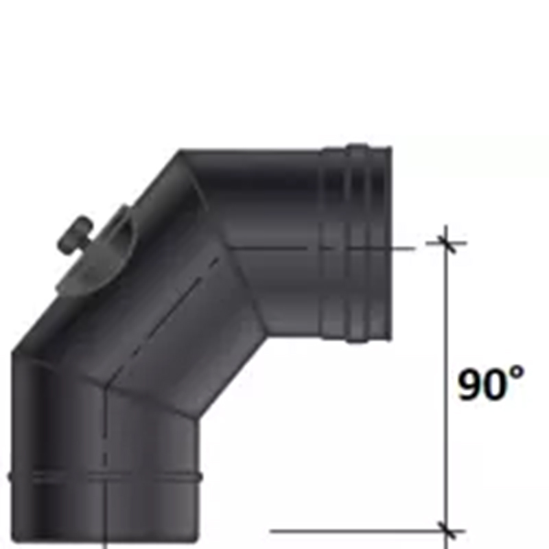 De Bocht 90° met inspectieluik – Ø150 mm – Enkelwandig geëmailleerd staal maakt het mogelijk om een rookgasafvoer in een rechte hoek te leiden en biedt via het inspectieluik toegang voor reiniging en controle. Het geëmailleerde staal is hittebestendig en heeft een gladde afwerking.