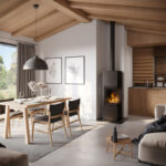 - Hoge glasruit aan twee zijden: Het grote glasoppervlak biedt een panoramisch zicht op het vuur, wat de sfeer in de ruimte verder versterkt