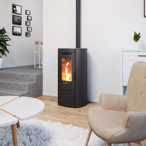 De Tjallmo is een geavanceerde en stijlvolle pelletkachel die dankzij het 3-zijdige glas een prachtig uitzicht op het vuur biedt. Deze kachel is ontworpen om optimale warmteverdeling te bieden, waardoor het ideaal is voor zowel grote als kleinere ruimtes. Met het vernieuwde dubbelglas en de mogelijkheid om de rookgassen via een Ø 120 mm schoorsteen aan te sluiten, blijft het glas langdurig schoon, wat zorgt voor minder onderhoud en een efficiëntere verbranding.
