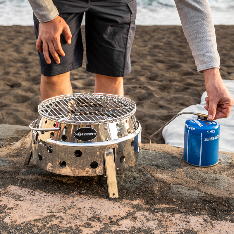 De geïntegreerde piëzo-ontsteking zorgt voor een snelle en veilige ontsteking zonder dat een aansteker nodig is. De grill werkt op standaard EN 417-schroefgaskartouches met een 7/16” x 28 UNEF-schroefdraad, die gemakkelijk verkrijgbaar zijn in de meeste outdoorwinkels.