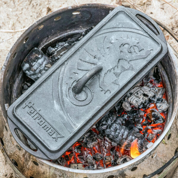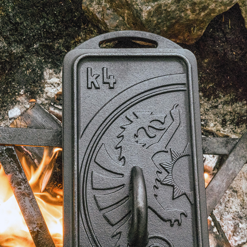 De duurzame gietijzeren constructie houdt warmte lang vast en verdeelt deze gelijkmatig over het hele oppervlak. De pan is geschikt voor gebruik op open vuur, in de oven of op de barbecue. De deksel is bovendien als aparte bakplaat of serveerblad te gebruiken, wat deze pan extra veelzijdig maakt.