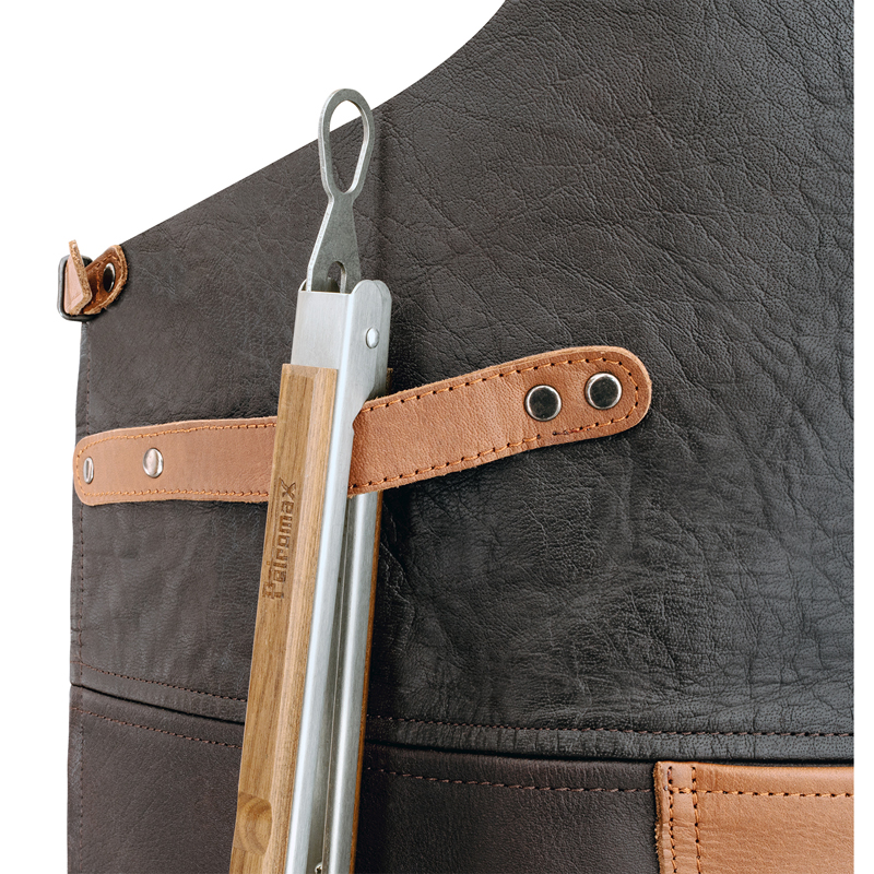 De verstelbare kruisbanden op de rug en de tailleband zorgen voor een perfecte pasvorm, ongeacht uw lichaamsbouw. Het schort is uitgerust met een praktische borstzak, een ruim heuptasje en een handige riem aan de zijkant voor het ophangen van accessoires zoals handdoeken of gereedschap. De combinatie van donkerbruin leer met cognackleurige accenten geeft het schort een tijdloze en professionele uitstraling.