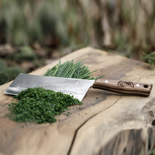 De Petromax Cleaver Knife is een krachtig hakmes, ontworpen voor het zwaardere snij- en hakwerk tijdens het koken in de buitenlucht of thuis. Het brede, 4 mm dikke lemmet van gehard staal is ideaal voor het bewerken van botten, harde groentes en grote stukken vlees. Dankzij de optimale gewichtsverdeling en de ergonomische greep in walnoothout ligt het mes stevig en comfortabel in de hand, zelfs bij intensief gebruik.