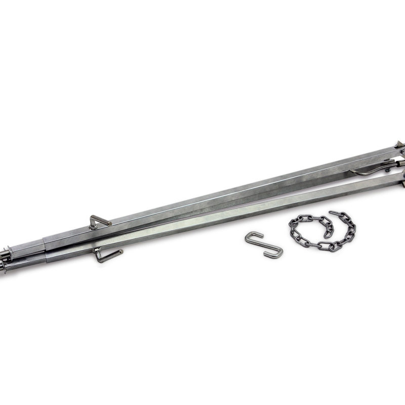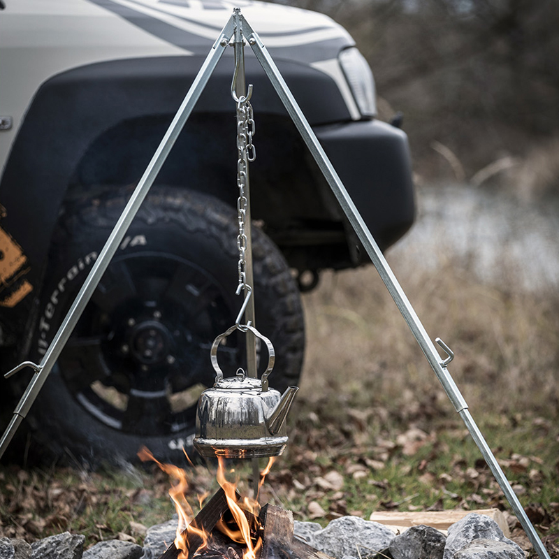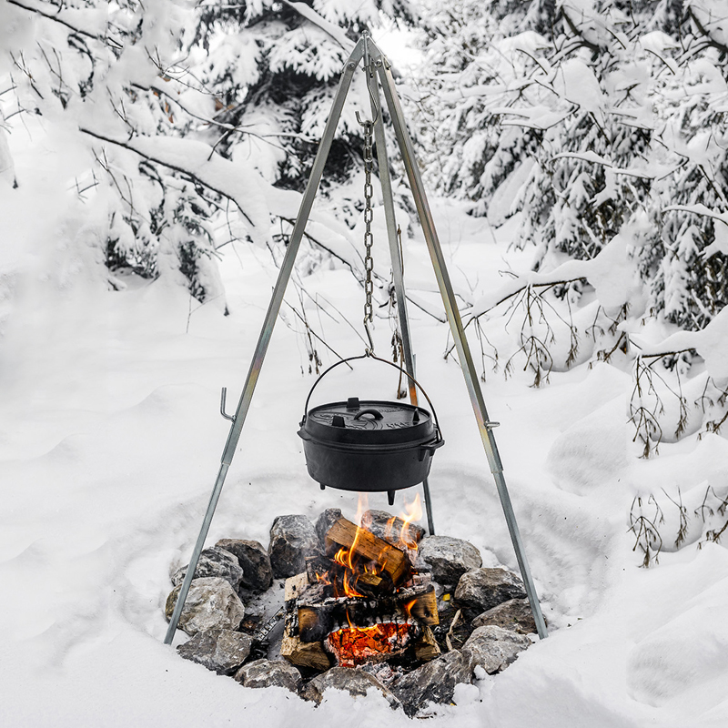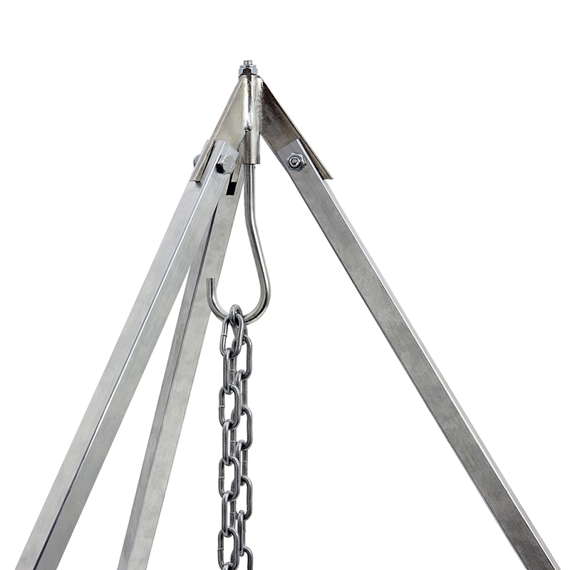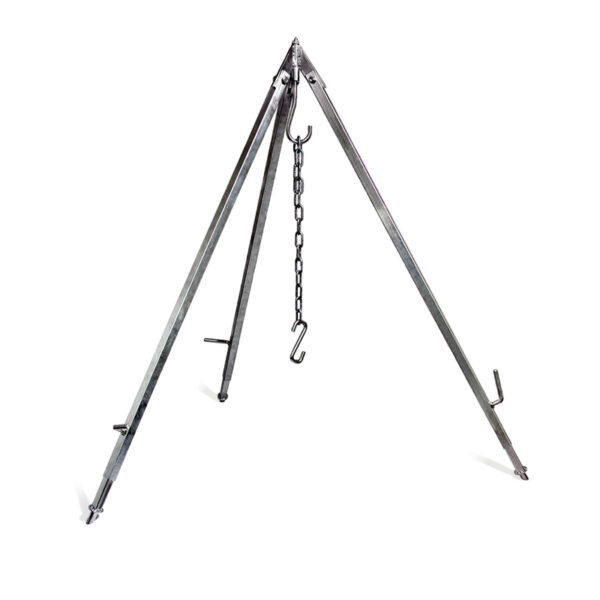 De poten van de driepoot zijn individueel in hoogte verstelbaar tussen 88 en 144 cm. Hierdoor staat de constructie altijd stabiel, zelfs op ongelijke ondergrond. De bijgeleverde ketting met haak maakt het mogelijk om de hoogte van je pan boven het vuur nauwkeurig te regelen, zodat je volledige controle hebt over temperatuur en garing.