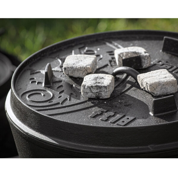 De Petromax Dutch Oven FT18 met pootjes is de ultieme keuze voor buitenkoks die voor veel mensen koken. Met een capaciteit van 16,1 liter biedt deze pan voldoende ruimte voor grote porties stoofpot, soep, chili of braadstukken. Dankzij de drie stevige pootjes staat de pan stabiel in het vuur of op hete kolen, wat hem perfect maakt voor kamperen, bushcraft of evenementen in de buitenlucht.