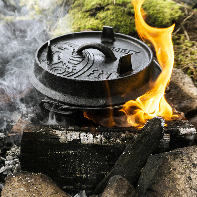 De stevige gietijzeren deksel houdt warmte en vocht vast en is ook als kleine bakplaat te gebruiken. De pan is voorbehandeld en dus direct klaar voor gebruik. Dankzij de stevige draagbeugel is de pan ook eenvoudig boven een vuur op te hangen, wat hem tot een veelzijdige keuze maakt voor elke buitenkok.