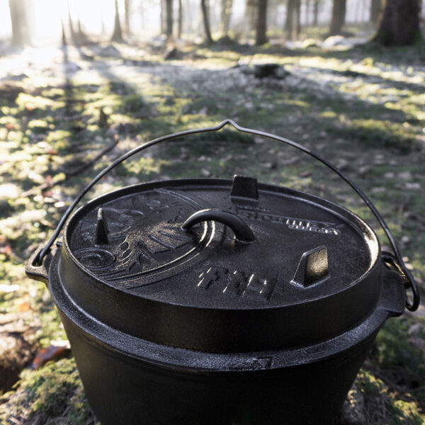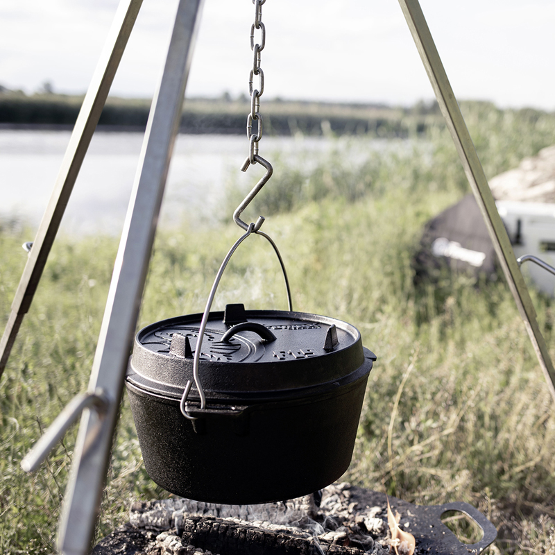 De multifunctionele gietijzeren deksel sluit goed af en houdt warmte en vocht optimaal vast. Hij is ook omkeerbaar te gebruiken als bakplaat of serveerschaal. De pan is voorbehandeld en daardoor direct gebruiksklaar. Dankzij de stevige draagbeugel kun je de pan desgewenst ook boven een open vuur hangen, wat hem een uitstekende keuze maakt voor zowel binnen- als buitenkoken.