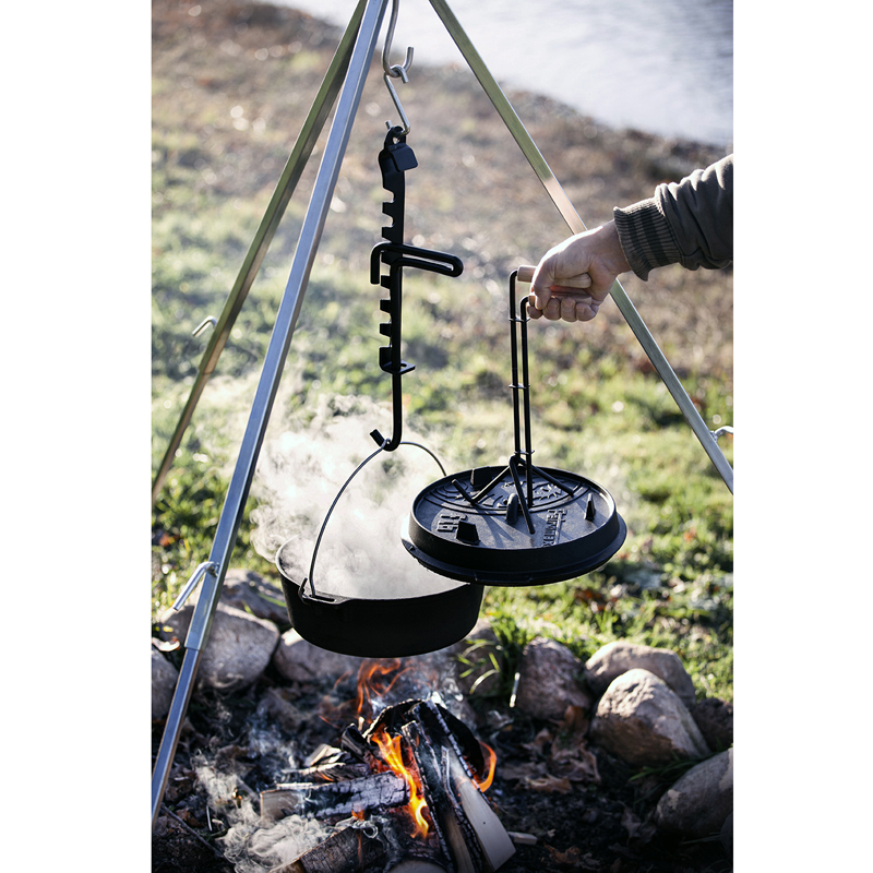 De haak is vervaardigd van stevig staal en ontworpen voor intensief buitengebruik. Hij biedt maximale controle bij het optillen van hete gietijzeren deksels, zonder dat je je handen dicht bij de hitte hoeft te brengen. Geschikt voor alle formaten Dutch Ovens en ook toepasbaar bij het optillen van grillroosters of andere hete onderdelen rond het vuur.