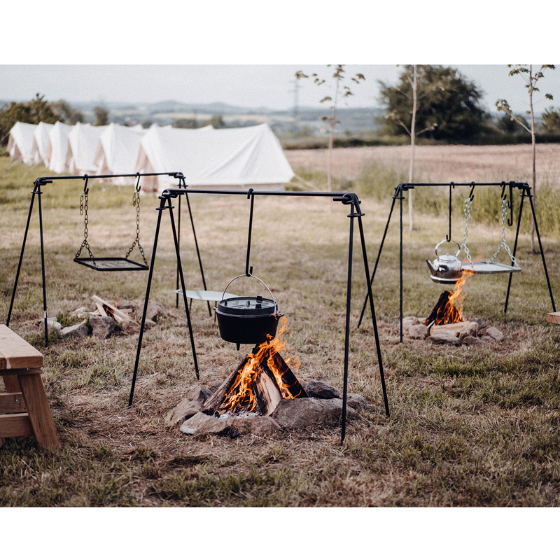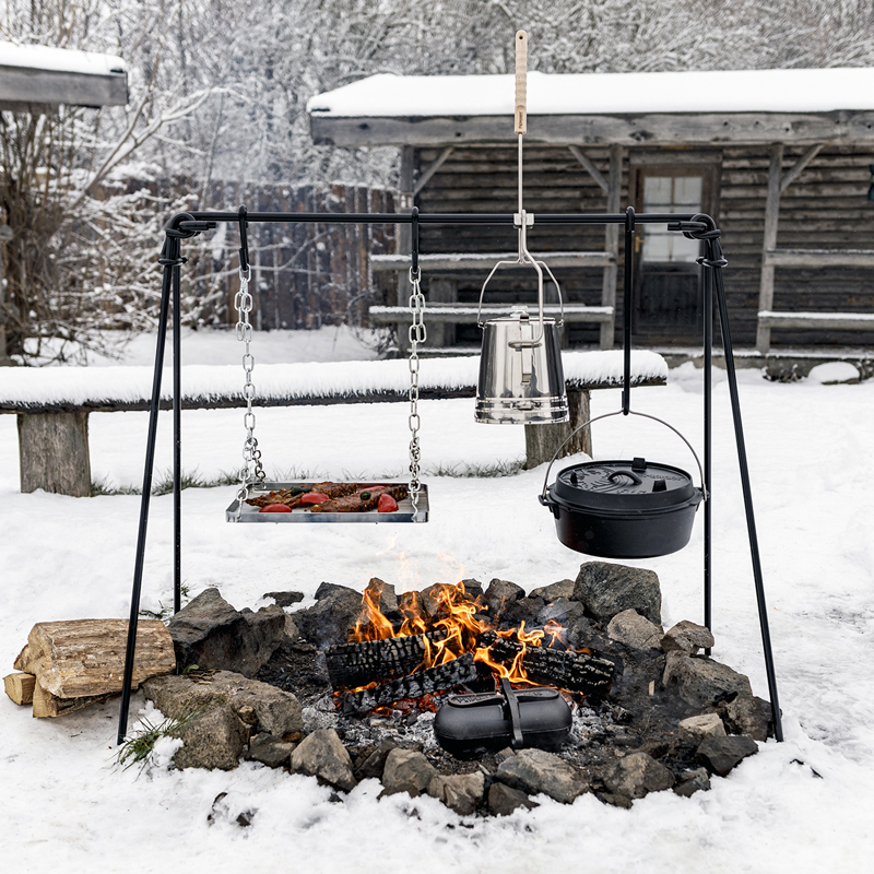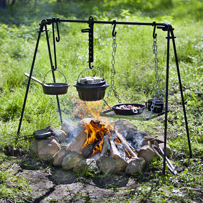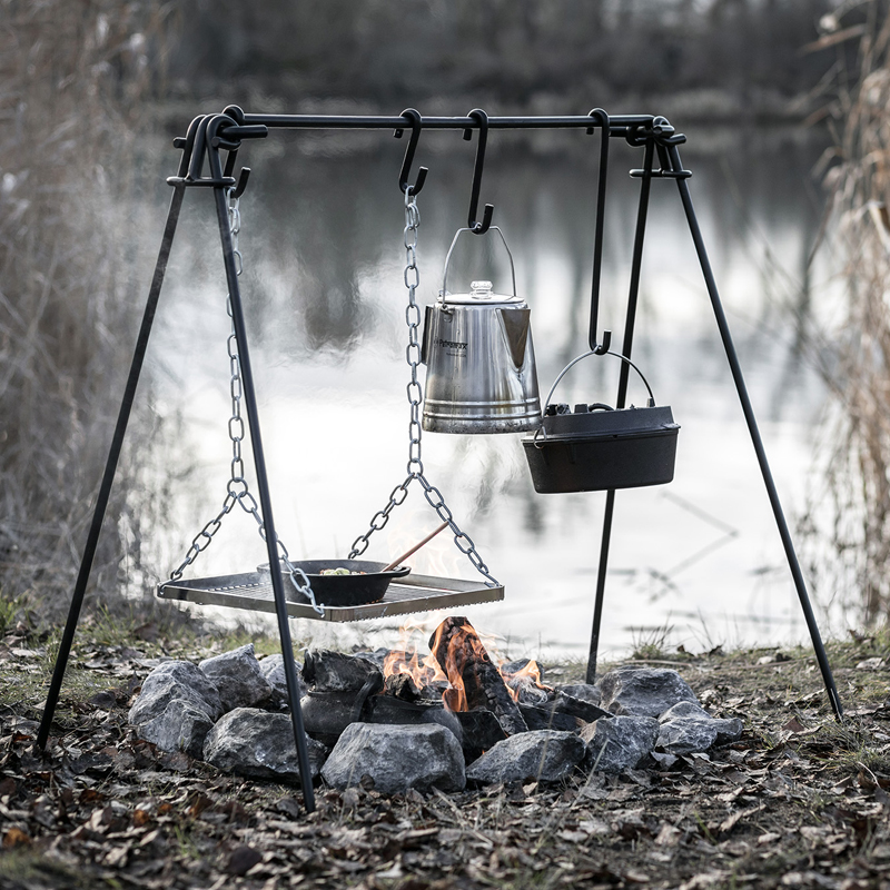 De Petromax Fire Bridge transformeert elk kampvuur in een complete buitenkeuken. Met een stevige, gepoedercoate stalen constructie biedt deze vuurbrug een stabiele basis voor het ophangen van pannen, ketels en percolators aan drie haken van verschillende lengtes. Daarnaast beschikt de Fire Bridge over een in hoogte verstelbaar grillrooster met kettingophanging, perfect voor het grillen van vlees, groenten of het warmhouden van gerechten.