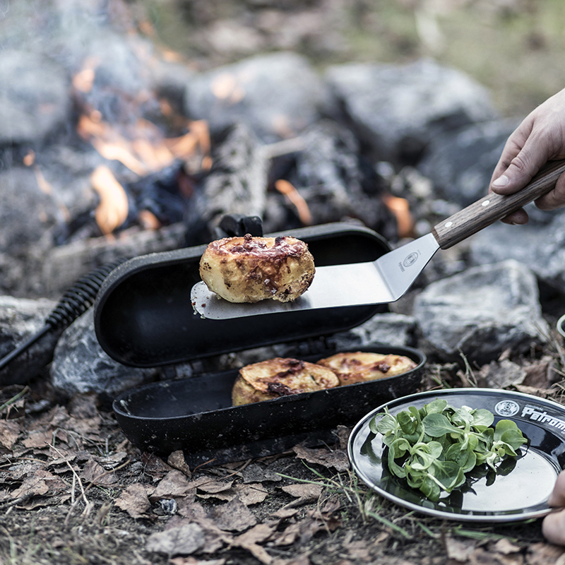 De Petromax Flexibele Spatel Lang is een nauwkeurig keukengereedschap voor de buitenkok die geen concessies wil doen aan controle en comfort. Dankzij het lange handvat en het flexibele blad draait u moeiteloos delicate ingrediënten zoals visfilets of dunne plakjes vlees op hete oppervlakken zoals een plancha of Dutch oven.