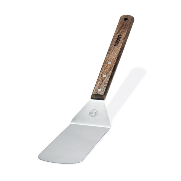 Het robuuste ontwerp ligt stevig in de hand en is bestand tegen hoge temperaturen, wat deze spatel ideaal maakt voor intensief gebruik bij buitenkoken. De uitsparing in het handvat maakt het ophangen eenvoudig, zodat hij altijd binnen handbereik is tijdens het koken. Een onmisbare tool voor iedereen die serieus met vuur kookt.