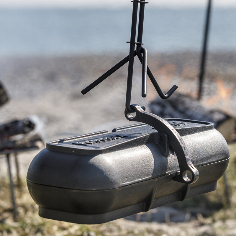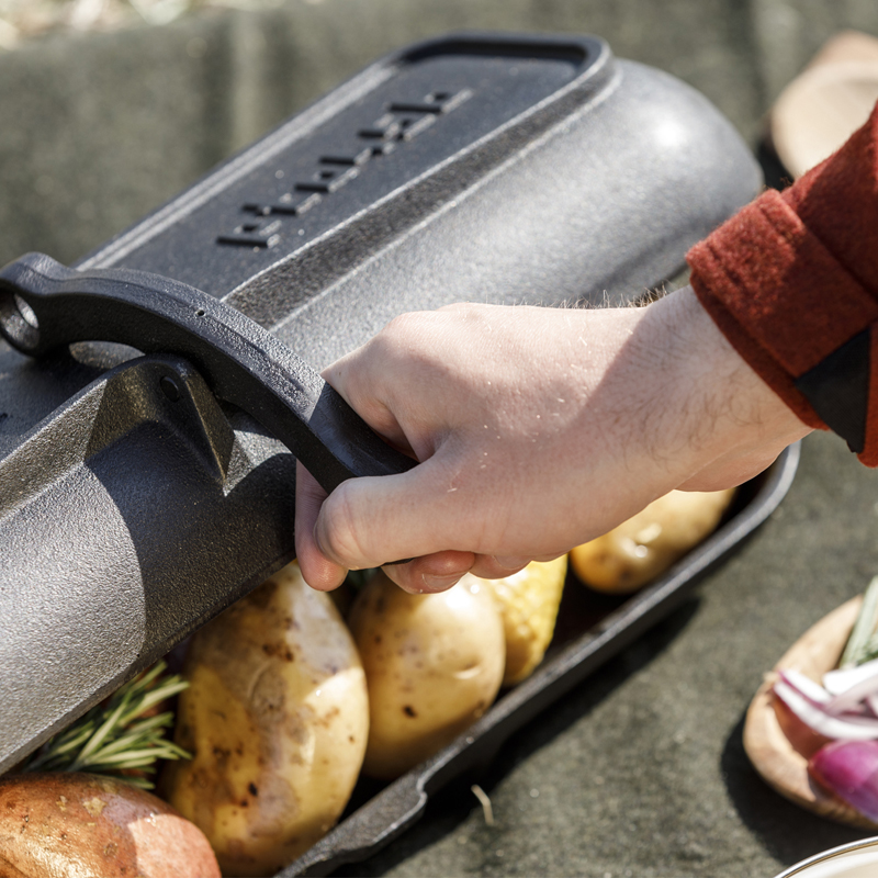 De Petromax Gietijzeren Aardappel Oven L is de grotere uitvoering van de populaire aardappeloven, ontworpen voor grotere gezelschappen of wie graag ruim kookt. Met een inhoud van 4,8 liter en een langwerpige halfronde vorm is deze oven ideaal voor het garen van aardappelen, groenten, stoofgerechten of zelfgebakken brood boven open vuur of in hete as.