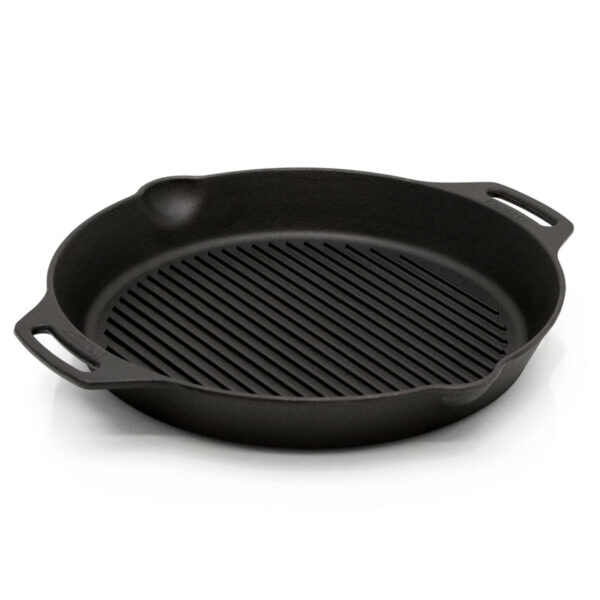 De Petromax Gietijzeren Grill Skillet 35 cm met twee handvatten is dé keuze voor wie groots wil grillen met ambachtelijke precisie. De geribbelde bodem zorgt voor die kenmerkende grillstrepen en laat overtollig vet gemakkelijk weglopen, terwijl het gietijzeren materiaal garant staat voor langdurige warmteopslag en gelijkmatige verdeling.