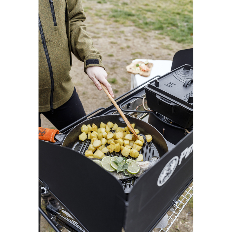 De Petromax Gietijzeren Grill Skillet 35 cm is ontworpen voor iedereen die groots wil grillen met authentieke resultaten. De robuuste gietijzeren pan beschikt over een geribbelde bodem die zorgt voor perfecte grillstrepen en efficiënte vetafvoer. De royale diameter maakt het mogelijk om meerdere ingrediënten tegelijk te bereiden – ideaal voor buitenkoken of grotere gezelschappen.