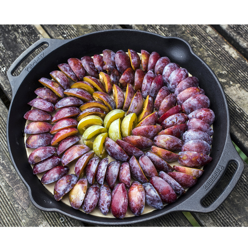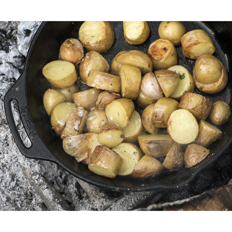 Met twee stevige handvatten is de skillet eenvoudig en veilig te hanteren, ook wanneer hij vol is of direct van het vuur komt. De ingebouwde schenktuiten maken het afgieten van vloeistoffen gemakkelijk. Dankzij de natuurlijke antiaanbaklaag en de voorbehandeling is hij direct klaar voor gebruik – een duurzame klassieker voor elke buitenkookopstelling.