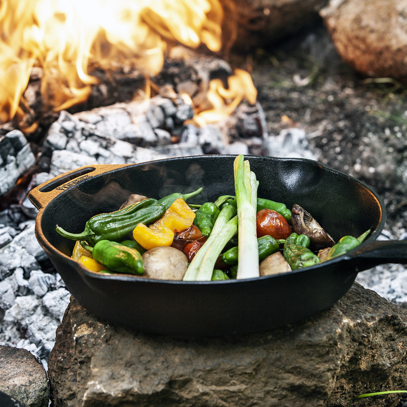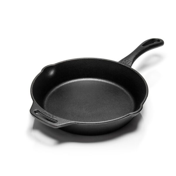 De skillet is voorzien van een stevig handvat met ophangoog en schenktuiten aan beide zijden, wat het afgieten van vloeistoffen gemakkelijk maakt. Bovendien is hij reeds ingebrand (seasoned finish) en klaar voor gebruik. Een duurzame klassieker voor intensief dagelijks gebruik of avontuurlijk buitenkoken.