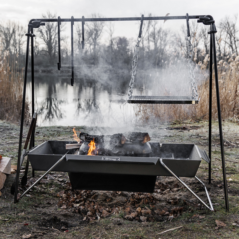 Dankzij de twee meegeleverde steunbeugels kan de vuurtrog worden verhoogd tot een hoogte van 30 cm, wat zorgt voor voldoende afstand tot de grond en voorkomt dat de ondergrond beschadigd raakt door hitte. De vuurtrog is compatibel met diverse buitenkookaccessoires, zoals een driepoot of vuurbrug, waardoor je eenvoudig pannen, roosters of Dutch Ovens boven het vuur kunt hangen.