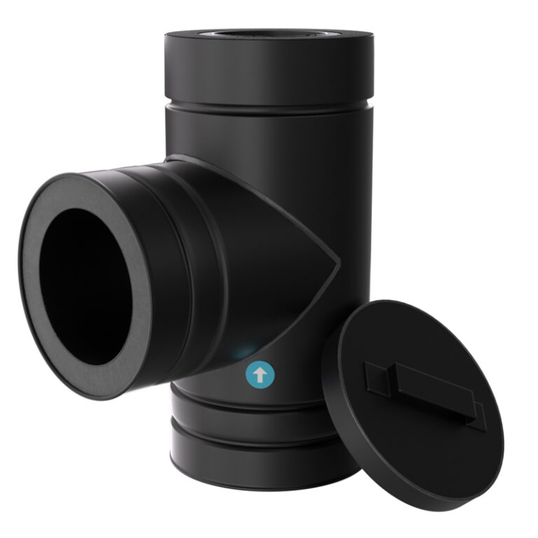 Het T-stuk 90° inclusief afsluitdop Ø125 mm – Isoduct dubbelwandig rookkanaal zwart maakt een rechte zij-aansluiting mogelijk op je rookkanaal. De meegeleverde afsluitdop sluit de opening veilig af wanneer die niet wordt gebruikt. De zwarte afwerking zorgt voor een strakke, uniforme look bij een zwart systeem.