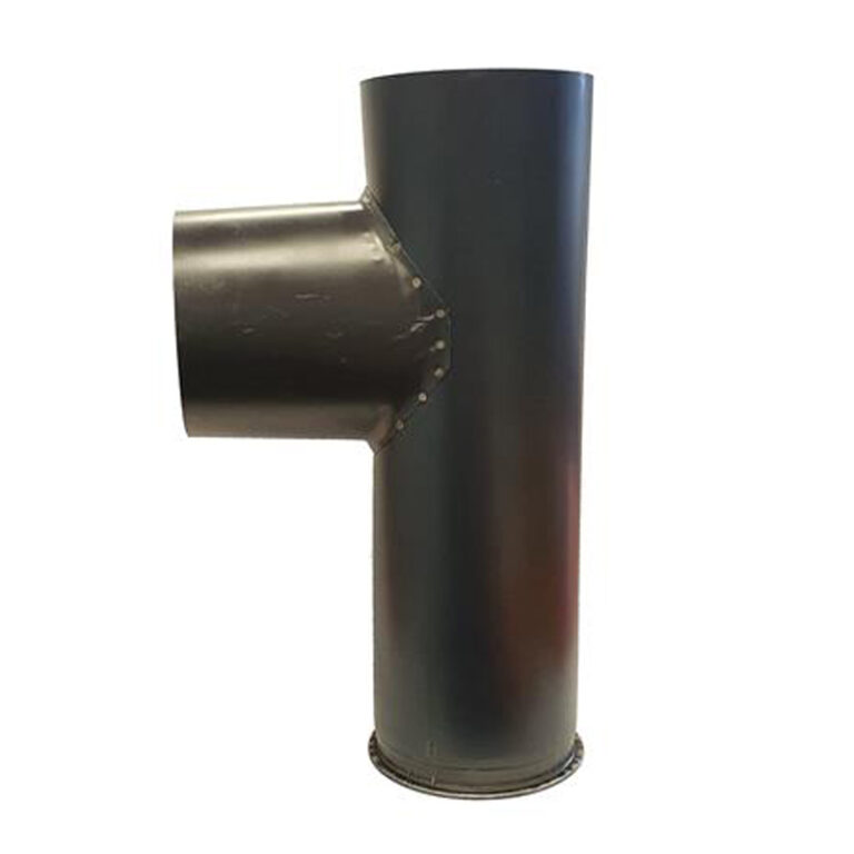 Het T-stuk Ø130 mm – 90° met deksel – Enkelwandig geblauwd staal is ontworpen voor het maken van een 90° aftakking in een enkelwandig rookkanaal. Dit T-stuk is voorzien van een handig afsluitdeksel, waardoor inspectie en reiniging van het rookkanaal eenvoudig uitgevoerd kunnen worden. Het geblauwd stalen ontwerp maakt het onderdeel hittebestendig, stevig en voorzien van een nette, donkere afwerking.
