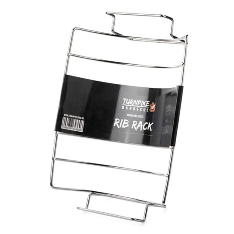 De Turnpike BBQ Stainless Steel Rib Rack is dé oplossing voor wie meerdere racks ribs tegelijk wil bereiden zonder ruimteverlies op het rooster. Dit stevige ribrek van RVS biedt plaats aan meerdere spareribs of baby back ribs in verticale positie, zodat je efficiënt kunt garen en een gelijkmatige rook- en hitteverdeling bereikt.